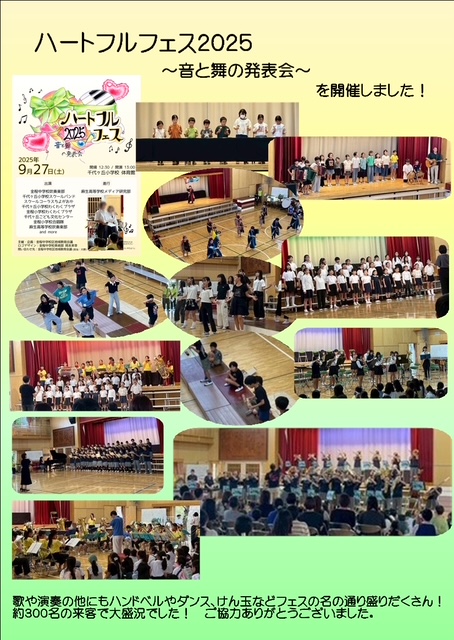 ハートフルフェス2025~音と舞の発表会~を開催しました。 から Kinoshita | 2025年10月11日 - 13:52 |2025年10月11日 お知らせ, 令和7年度, 地域のNews, 地教からのお知らせ, 活動報告, 活動年度 2025年9月27日(土)に千代ヶ丘小学校の体育館にて、千代ヶ丘小学校、金程小学校、金程中学校、麻生高校の児童・生徒の皆さんが日頃からの努力・練習した成果を、地域の皆様に披露して頂きました。心温まる素晴らしいフェスを開催する事ができました。出演者の皆様、そしてご来場して頂きました地域の方々のご協力に感謝申し上げます。 ブックマーク パーマリンク.